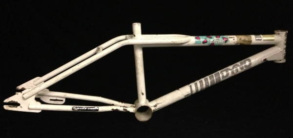 Bob Morales, www.facebook.com, december 2013: After I sold Dyno to GT Bicycles they asked me to design a new freestyle frame. This is the prototype that the production is based on. Hand built by Gary Turner from GT frame components and tubing this is the very first Dyno frame prototype. It does not feature the bend in the top tube at the seat stay / platform junction that the production models have. After initial testing I felt it was not unique enough and I suggested the bend in the top tube to give clearance to the seat stays platform and to give it an original design feature. After initial testing to confirm strength and handling, this frame went on to be used by me as a test bike for other GT and Dyno products I designed and developed for them. This frame was also later used to develop the first Kore product the Thrashguard (The first bolt on bash guard). Kore Bicycle Components was a company I started after I left GT in 1987.