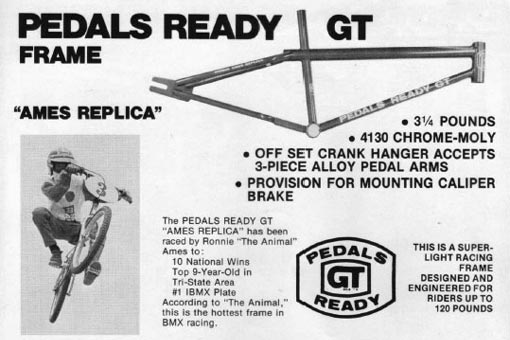 ![]() Gary Turner ![]() Richard Long ![]() Pedals Ready GT frame. Advertisement in the first issue of BMX Action, december 1976. |