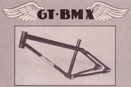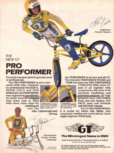 | 1984 | GT arrive en France officiellement. Bicross magazine mars 1984: On trouvait déjà quelques pièces GT en France, arrivant par des chemins tortueux et à des prix élevés. Il fallait qu'une véritable entreprise d'importation se penche sur la question. C'est fait avec Mobycycle à Nantes. GT frame standers. Ad in BMX Action september 1984: This unique design from GT is trick. GT factory, they go onto the rear axle, clean and simple. They work great for climbing all over your bike. Bob Morales and Eddie Fiola designed the first GT freestyle frame and named it the GT Performer. Ad, BMX Action may 1984: Freestyle has just moved up to the level of professional. The Pro Performer is not a converted BMX bike. Deigned by professional freestylers, Eddie Fiola and Bob Morales, the Performer was engineered specifically for stylin' from its uniquely bent down tube to extra wide lower chain stays for climbing all over the bike. Lightweight and strong, the Performer is all new and all GT. The freestyle Performer frame and fork becomes the Pro Performer complete bike when GT puts it all together with components like their 4130 chromoly handlebars and laid-back seatpost, GT high pressure tires, Dia-Compe front and rear brakes, Tuf Neck stem and freestyle tuff Skyway wheels. The GT Pro Performer, if it works for riders like Eddie, who constantly redefine the word radical, it just might improve your style. Ron Wilkerson: GT was coming out with a freestyle frame and we were TOTALLY stoked because that was a BIG thing - another company besides Haro making a freestyle bike. Bicross magazine: Ils jetent ainsi les bases d'une nouvelle géométrie qui sera reprise (copiée ?) par la plupart des constructeurs. A l'époque, les principales révolutions concernent le cintrage du tube inférieur au niveau du tube de direction et la plateforme rabaissée. ?: The bend at the top of the downtube was to enable full 180° x-up without crushing the front brake cable (this was before Potts Mod cable routing) |
