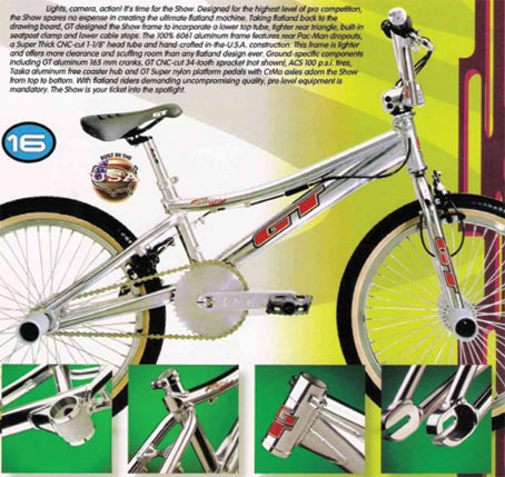 | 1998 | GT SHOW. 6061-T6 Aluminum is introduced to freestyle by the groundbreaking GT Show flatland frame. With close input from legendary flatlander Ruben Castillo, Robert Kahler and Jeff Soucek designed a frame specifically for the discipline of flatland. Rueben Castillo, Ride BMX US february 1998: It's basically a thought that came to my head when I started flatland to get a small lightweight bike. Smaller than any other flatland bike, I'm only 5'3" and a half. Most bike geometry's are made for someone around 5'10 or a 6 footer. I helped with Woody Itson and some of the people at GT. We came up with a bike that has an 18" top tube and a 13" rear end. It's something that has never be done before. We all put our heads together and came up with something that we are really happy about. QUESTOR. In the summer of 1998, Questor, the money behind Schwinn Cycling & Fitness bought GT Bicycles Inc. for 175 million dollars. Schwinn and GT merged to form a global company with two powerful brand franchise and well-established market leadership positions in several bicycle and fitness segments. |