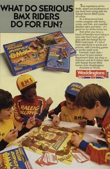 | 1985 | Raleigh Burner BMX board game made by Waddingtons in 1985. Raleigh introduced another innovation - the Vektar. With "Star Wars" styling and "Knightrider" technology including a trip meter and FM radio with presets it becomes a "must-have" for the 80's cool kids. Tony Hadland, june 2000: By 1985, Raleigh itself was suffering badly, as BMX rapidly died. Being essentially a bicycle designed for a seven-year-old but ridden by 7-17 year-olds, there was no moving up to bigger machines as riders grew. Everybody who wanted a Raleigh BMX bike bought it in the first two years. Thereafter Raleighs UK sales plummeted. By 1986, sales were 38% down on the 1983 peak. |