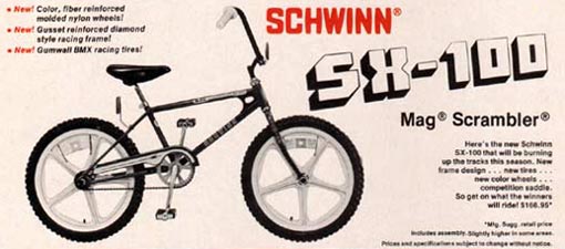 Ad in BMX Action august 1978: Here's the new Schwinn SX-100 that will be burning up the tracks this season. New frame design... new tires... new color wheels... competition saddle. So get on what the winners will ride! $168.95.