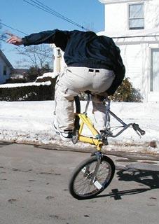 | 2004 | Believe it or not, I'm working on a few original flatland moves. I didn't follow any BMX during the 90's... but kept thinking about it. When I came back and saw what everyone was doing, I realized I still had a lot of originality going for me. I'm working on some of those moves right now. Still need some (some?) conditioning, better weather, and practice, practice, practice -- but it's all very possible and likely to turn some heads if/when I get it down. Of course until I get it down or give up, it's strictly confidential. |