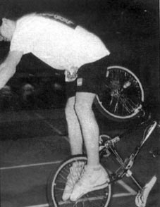 | 1989 | The '89 AFA Masters in Boise, Idaho was the first national event I won, and I'd pay money to have video of me beating Trevor Meyer. After I thrashed a perfectly good pair of Peregrine bars learning Hitchikers when they came out in 1989, I developed something I've seen some newschoolers using even today. I threw some Profile Sealed BB Bearings onto some Jive Handle bar-ends and problem was solved. Nowadays I've got the alloy ends like everyone else. Good way to learn how to do the trick, or save your bars from the occasional stop-and-grind. Got the idea from Bill Neuman, but he used smaller wheel sealed bearings that you couldn't put much weight on or else they'd pop out. In 1989, all the 'old pros' left the scene... except DMC. As far as I'm concerned, he was so cool it more than made up for that. After I won Idaho and Minnesota Masters he started sending me free 'On Edge Apparel' garb. Stickers, Hats, tanks and T's that I still have today with his letters thanking ME for helping HIM! I was honoured, to say the least. He was really a laugh-riot, too. He was unsponsored in '89 and really mingled well with everybody, including all the 'new' pros like Danny Meng, Bill Neuman, and Perry Mervar. He never held 'who he was' over anybody, if he ever even realized he could have at all. I remember after the California comp, a lot of guys were asking him to buy booze (not me, of course) so they could celebrate/drink away sorrows, and he proceeded to refuse and lecture them on the perils of alcohol. I thought that was classy. I used to do the occasional rolaid, but I couldn't stop from it becoming a bunnyhop rolaid where my rear wheel caught about 3 inches of air. People thought it was some new innovation. I kinda stopped doing them when I forgot my routine once and decided to throw one in for the hell of it, without really polishing up on it--the result was ugly. Luckily it was just a local comp. The gliding caboose pic was taken at a King of the Flatland comp in late '89. The truth of the matter is that Kevin Jones stayed over my place in early '90 and picked that up from me. It, along with two other good tricks (backwards megaspin into a backwards decade) that ended up in the next Dorkin' vid (#4?). I also showed him an editing technique that got honorable mention in FREESTYLIN'. I'm not complaining, as a LOT of the tricks I was doing were his brainchildren. I was flattered, actually. I was a bit miffed he made off with my Flight 401 wrenches and that porno tape, though. Honestly. lol. 1st place 17x experts @ AFA Masters Final in Fountain Valley, CA November '89 I won 17x. It was one of the highlights of my "career" (Day Smith got second). It was bittersweet because they failed to put my entire class in the results, and I felt proud about being an East-coaster from snowy Connecticut and winning the finals in LA. That night about 12 of us packed into Perry's mini-van; Bill Nitscke, Neuman, McCoy, Meng, Steve Mulder, Me and God knows who else. We went to this fancy LA eatery and Dennis introduced me to Fajitas and Soapapillas (sp?). We collectively decided to do a dine-n-dash, and got busted by the cops a few miles down the road...it was awkward to say the least...everyone looking at eachother and pulling crumpled dollar bills out of their socks and trying not to laugh while counting loose change in the console until we coughed up enough for the bill. |