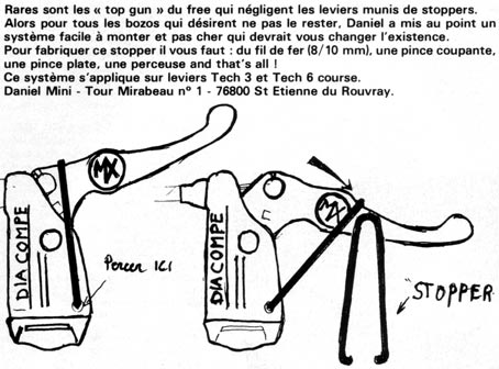 Daniel met au point un système pour ajouter un stopper sur un levier de frein classique... Son truc est publié dans le Bicross magazine #53 de février 1987.