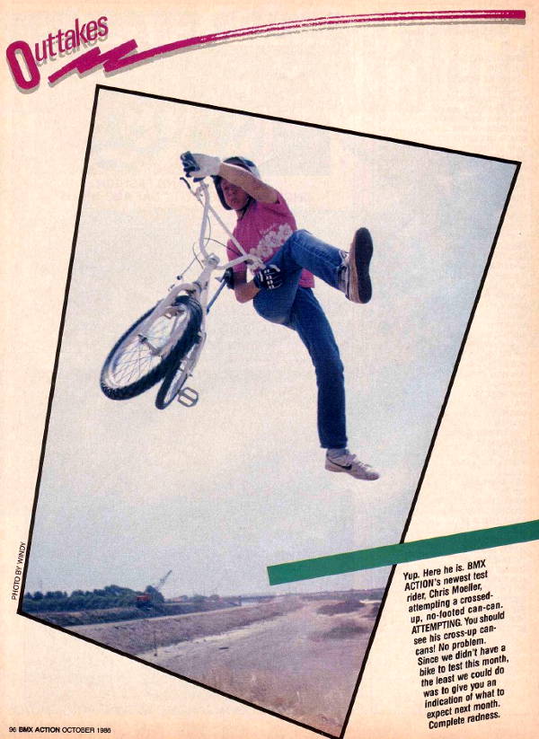 | 1993 | Chris went over to England for his first Backyard Jam and wound up in the hospital after wrecking himself in front of a huge mob. Brad McDonald and John Paul Rogers co-interview Chris Moeller in Ride BMX US #6 august september 1993 |