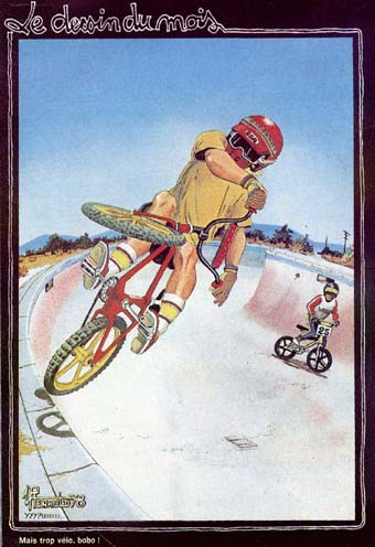 | Skateboarder, february 1980: Fall, 1978. Paramount Lakewood and other Southern California parks begin reserving sessions or whole days exclusively for BMX. Tinker Juarez, a top bicycle motocross circuit racer, makes the cross-over better than most, innovating amazing freestyle moves on the vert. In '78, you were definitely a nobody unless you had a pair of Red Line V bars clamped to your stem. Your stem was probably an Ashtabula (if you were short on cash), or a Mongoose or Cook Bros. (if you were rich). Still, no matter what your cash flow was, Red Line V's were HOT items. The hot bike was a Mongoose. Tinker Juarez, Brian Curnell, Jeff Kosmala, Kenny Knachman, and Dan Oakley were the Factory 'Goose squad. All of those guys ripped. First issue of Bmx Plus! in november. Pour faire connaître ces vélos dun genre nouveau en France, il faut des courses. Quatre clubs vont ainsi voir le jour : Beaune, Altkirch, Delle et Romans. Le premier club est créé à Beaune en février 1978. La Fédération Française de Bicrossing est créée le 1er mars 1978. OTB dessine un aerial dans les pages du magazine Moto Verte. |