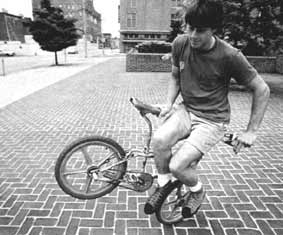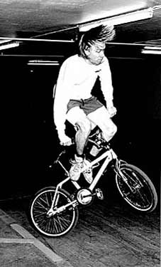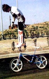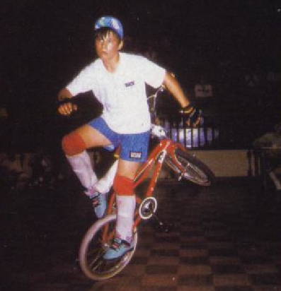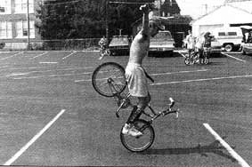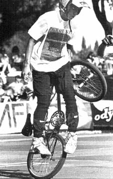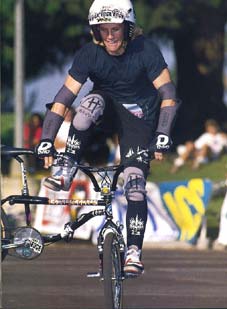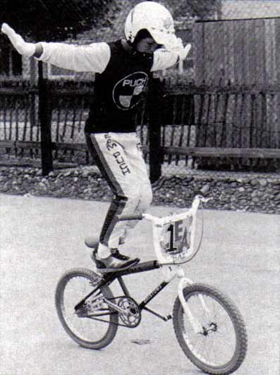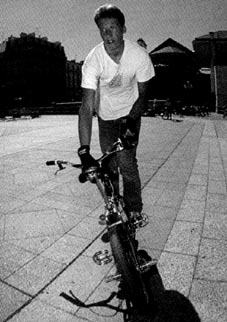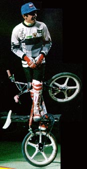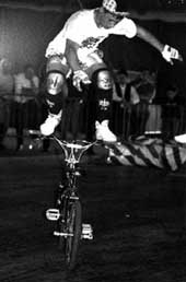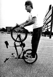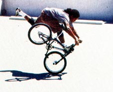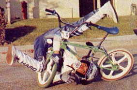 The mc in mccircle does indeed stand for McKee. Freestylin october 1987: Marc McKee invented it, McCoy refined it, Denny Howell owned it. Ken Evans, october 2005: Denny Howell and I grew up as next door neighbors and we rode together all day every day. Denny did that trick in such tight circles that it literally looked like his front wheel never moved from one spot and he spun faster than everyone else on that trick. Denny came up with a similar trick on the back tire - someone dubbed it the "Howell Spin" but I don't know if it ever stuck or not. |