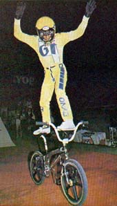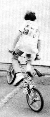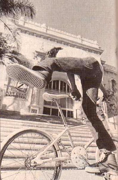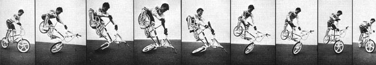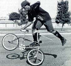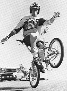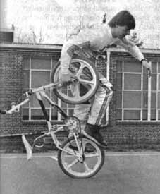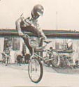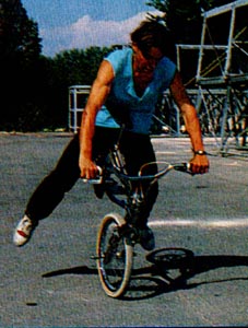 | rock walk | The first flatland trick. www.vintagebmx.com, july 2005: In the late 1970s Bob Haro was the staff artist for BMXA in Torrance, California. On weekends he would drive to San Diego to ride bikes with his friend John Swanguen. In September of 1978 Bob Osborn saw Haro doing a Rock Walk in the parking lot outside the Wiz Pubs offices during lunch break. Osborn immediately photographed the trick. The resulting article, "Trick riding... a whole new thing", was published in the January/February 1979 issue of BMXA. Here is a quote from the article: "Haro and Swanguen used to ride Skateboard Heaven in San Diego, trying to out-trick each other. Gradually the tricks evolved out of the skatepark bowls and onto the flatlands, where they were refined and improved to fit the new environment." The Rock Walk was not just a step up in difficulty over stunts kids had been doing on bikes for decades, it was an evolutionary leap...and it was BMX-bike specific...meaning it is highly improbable that this trick could have been invented on any other kind of bicycle existing at the time. For the above reasons, and because our research turned up zero evidence of any earlier flatland tricks, the Rock Walk is hereby entered into this history as the first documented flatland freestyle trick. |