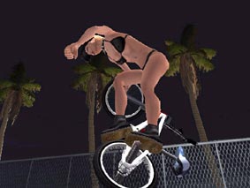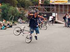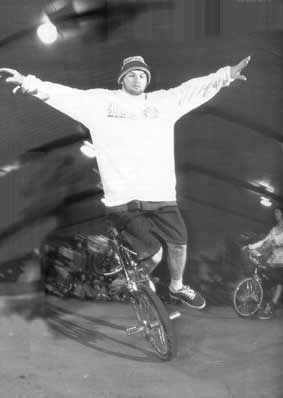 | megaspin | BMX Plus! july 2000: One of Jason Parkes' early rolling and spinning moves. One foot on the rear peg and the other kicking the tire as the byke spins on the back wheel. Megaspin to tailwhip air to megaspin. Martti Kuoppa. 2006. |