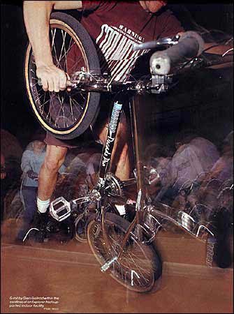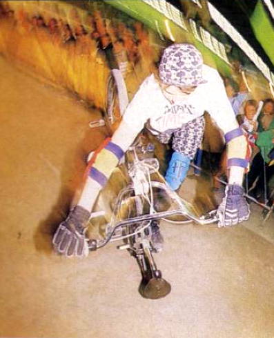 | steamroller | Mark Eaton 1986 Mark Eaton, Ride BMX US april 2001: At the end of 1986 we -the Plywoodhoods- went to the AFA Velodrome contest (CA), and there were some groundbreaking tricks coming out like backyard and funky chickens, and we were trying to push some tricks and come up with whole new tricks. For the longest time I was working on holding the seat, pushing with my foot and then just cruising in the steamroller position, but whipping into it wasn't even a thought. No one had done any tricks were you didn't use the brake and whipped in it. When I got back from that AFA contest I was Really motivated and pumped to learn it. I was in my basement just trying and trying to whip into it, and finally, I was able to whip and hold it. Lancer le cadre comme un whiplash, rattraper la selle avec une main, rouler sur la roue avant un pied servant de balancier. |
