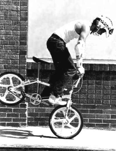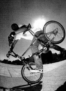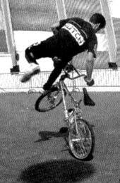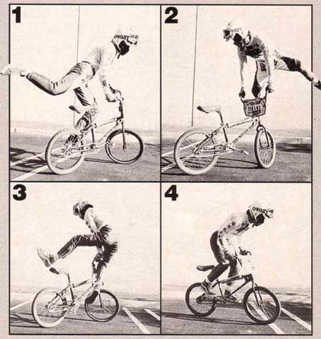 | miami hopper | The rider stands on the pedals and grasps the seat tip in right hand, and the front brake lever in left hand. The rider quickly applies the front brake and simultaneously rotates the handlebars 90 degrees counterclockwise towards the seat and pulls up sharply on the seat. This will cause the rear of the bike to rise up and seemingly flip over the front. If landed correctly, the front wheel will lay parallel to the ground and the right handlebar grip will be balancing on the ground leaving the rider perched above the rear wheel. From this position, the rider can make various poses, kick the bike out to the side and lay it down, or lean back sharply and reverse the trick and ride away. *note* the hands and handlebar directions would be reversed if the bike was set up with the front brake lever on the right hand side. Miami hopper first appeared in the march 1985 issue of BMX Action. R.L. Osborn, BMX Action march 1985: When I was doing some freestyle shows in Miami, Florida, this winter, saw one at the locals do the trick. His name was Paul Hopper, and he's a really nice guy. After I got this trick wired, I came up with a few variations of my own, and since Paul had no real name for it, I'm calling it The Miami Hopper after him. Before I go any further, I just want to remind you folks that trick riding can be hazardous to your health, so ABSOLUTELY use your safety gear - helmet, elbow pads, gloves, and long pants at the minimum while you're learning this or any trick. Whether you use it after you've got the tricks wired is up to you, but use your best judgment. Now, on to the trick. The Miami Hopper is an advanced maneuver; a beginner shouldn't EVEN try to do it. You should know how to do a bar endo, which some people also call a dip, before you' attempt this. I'm just going to show you how to do the basic trick, and you can work on the variations later once you have everything dialed. The first thing you do is roll forward slowly, standing on your pedals with your knees slightly bent and your weight back. Then, like a front brake endo, you start by grabbing the front brake and throwing your weight forward while you let the rear of the bike come up into your body and you tuck your buns WAY back. But for The Hopper you have to do a few other things in rapid order. As you grab the front brake you quickly crank the bars to the left so that they're at a 90 degree angle to the rest of the bike. Make sure you keep the front brake locked at all times. Then you let go of the bars with your right hand and use it to grab the back of the seat. This makes it easier to tuck WAY back and gives you more control for balancing, As the endo progresses, let the bike go all the way forward so that the lower end of the bars gently touches down on the ground. Between the front wheel and the end of the bars, you're now set up on sort of a tripod. Your front wheel will probably be flexing a whole bunch. At this point, you're constantly trying to find your balance point. You'll be twisting the bars and the bike back and forth so that the rear end of the bike stays pointed skyward. It helps if you leave your left hand on the grip and front brake lever, but bring the bars around until you can grab both the grip end AND the front of the seat in your left hand while still keeping a two-finger death grip on the brake lever. Balance for as long as you can. Then, to get back to the normal riding position, move your hand from the back of the seat to the halfway point of the seat post, lean forward slightly, and then throw your weight back HARD 'cause it's way harder to get out of this trick than it is to get into it. The faster you pull back, the easier it is to keep your balance. As the rear end is heading back toward Mother Earth, release your hold on the seat post, straighten out the front wheel,- and grab the right grip. Hold onto the front brake lever until the back wheel reaches the ground. When the back end touches down, you'll naturally go for a short rollback, and then you just ride out of it. That's it !! The Miami Hopper took me about three days before I had it down. I recommend that riders learning this trick put the bike in the vertical position and then practice how to balance before trying to ride into it. Jason Weatherly, www.pedalbmx.com, november 2005: The miami hopper was first called a "bar endo", then a miami hopper (which was kinda dumb because at first no one "hopped" a miami "hopper"), then when they started hopping them they became "miami hop hops", then with locking levers there came no-handed miami hop hops and then finally like 1986 or 87 Martin Aparijo pulled the no-handed bar spin miami hop hops, where he would flip the bars between hops. Brett Downs, www.pedalbmx.com, november 2005: The bar endo probably preceeded the miami hopper. RL Osborn was doing shows in Miami when he met a guy named Steve Hopper doing the trick. RL did a how to in BMXA and gave it the name Miami Hopper. Park Carter did no handed miami hop hops in 87 or 88. Danny Barrado, august 2007: My name is Bong Air and my trick is the Miami Hopper which was named after my riding partner Hopper Paul by R L Osborn when he visited us in Miami in 1984. The event was the World of Wheels auto show at the Hollywood Sportatorium. There was a contest for BMX TRICKS run by MCS bicycles and NFA.This is where the BAR STALL (Miami Hopper) was first used in a contest.The announcer said here is Bong Air, I roll out on my Haro Freestyler, open up a tallboy can of budweiser and pound it. Then I went out and did all the latest tricks flawlessly including the bar stall on the top of the wedge ramp, I gave it my all and from the crowd response I knew that I had won without a doubt. They gave me third place, team MCS got first and second. I confronted the judges and they said they didn't like the way I drank a beer. I told them to go to hell.The fool they gave second to had a cast on his broken arm and the other guy was lame. R L was 