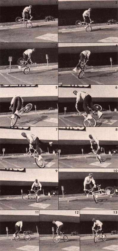 | backward decade | Jeff R.: Joe Gruttola was doing these in 87' I believe. Freestyle BMX UK april 1988 how to do: To do this trick you must know the bike like your own body. Jason Webb goes around in backward infinity roll, then when he's ready and not before, he jams on the back caliper, launches off the rear tyre and floats around the head tube. He makes sure his right foot contacts with the frame again, sort of sits down on the bars and rides away. |