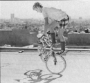 | track stand | Brett Downs, www.pedalbmx.com, november 2005: What people call a track stand today is done on the peg. Back then we called it a fork stand. The track stand was done with the foot on the pedal and the hand on the tire for balance. | |