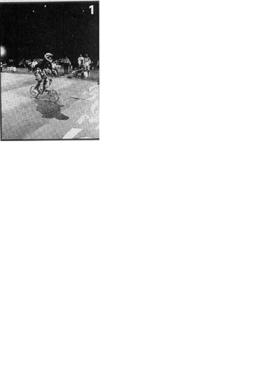 Every year there was an annual spectacular race in Bercy stadium in Paris. After the last stadium race was run, it was demo time. The show went well, Kevin ripped up the ground with his trademark swirling flatland boogie, and I pulled all tricks out of my bag, saving the best for last. While I caught my breath I called Spike over. "Put in a fresh roll and shoot a sequence of this next one," I said to him, trying to sound casual. "I'm going to try a flip." Spike found his angle just as I was ready, and I hit the Coca-Cola quarterpipe at full speed. I pulled off the coping, leaning back as hard as I could, and got about six or seven feet out as I peaked. I remember being upside down, seeing flashbulbs popping. I don't think the French spectators were ready for what they saw, but the reaction was thunderous. I landed hard and slid out, but I guess that didn't matter. History was made People freaked, and the promoters wouldn't let me ride anymore because things were rapidly getting out of control. The floor was rushed by fans and riders, and some kid grabbed the laminate around my neck, strangling me until he got his souvenir. The flip fakie made the cover of five bike magazines, including Go, with a headline that read: "Sickest Trick Ever:'