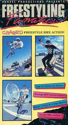 30' long video released in 1988 by UNREEL productions inc. Produced and directed by Brian Gillogly. Executive producer: Brad Dorfman. www.rottentomatoes.com: This film captures the most exciting and up to the minute action taking place in the world of freestyle BMX bicycling. See the top pros performing outrageous aerial maneuvers, and the newest, most bizarre forms of flatland freestyle. Eric Rothenbusch, www.23mag.com, december 2003: Merci famille Dehove pour cette cassette qui m'a fait plonger moi et l'ensemble de mon entourage (bmx ou non) dans le fabuleux univers du bmx freestyle à la fin des années 80. La vidéo est sponsorisée par Vision Street Wear qui fournissait apparement le déguisement obligatoire pour la majorité des riders de l'époque. The young dudes (Chris Day, Nathan Shimazu, Jeff Cotter, Chad Johnston, Leo Chen, Pete Augustin, Ron Camero et Scott Robinson) ouvrent le bal avec du sol. On découvre ainsi les premiers megaspins mais aussi undertaker, decade, surfer, gripstand et surtout un extraordinaire fly boomerang superman avec les jambes à la verticale par Nathan Shimazu. Un petit peu de halfpipe ensuite avec un contest AFA à Palm Spring CA. et un KOV à Leucadia en Californie aussi. La section suivante est d'anthologie, il s'agit de l'infamous outlaw routine de Dave Vanderspek pendant un contest AFA. Indescriptible... il faut le voir. La vidéo se poursuit avec une interview de Brian Blyther doublée par Ron Wilkerson (ça aussi il faut le voir pour comprendre), un petit passage de Krys Dauchy et enfin Brian Blyther et Dave Voelker qui font du trial sur des voitures. On passe aux choses sérieuses avec DMC qui rentre des combos rapides, du cherrypicker et un hang 5 to whip to frontyard au sol puis 270 drop'in et cancan lookback en rampe. On continue avec R.L. Osborn (General) et Ron Wilkerson qui fait pedal picker drop in et nothing en rampe. Un petit flashback avec Brian Blyther dans le pipeline d'Upland en 1985. Martin Aparijo rentre des cowboys no hand barspin, backward gripstand, pedalpicker to decade et backyard avec du mal. Woody Itson rentre des enchaînements plus récents (relativement) avec troley (une sorte de squeak en death truck) et caboose no hand. Voilà donc une très bonne vidéo de plus à regarder en famille. |