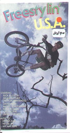 | Freestylin U.S.A. contains some of the world's hottest old school freestylers that perform flatland freestyle, aggro street style, and high flying vertical stunts. The actions hot, and so is the music. It's freestylin' U.S.A. Starring Rick Allison, Brian Blyther, Trevor Hernandez, David Nori, Marty Schlesinger, Eddie Roman, Karl Rothe and David Voelker. Music by Hurricane, Metal MC, and MX Machine. Simitar Entertainment production, Color, 48 minutes. | ![]() |