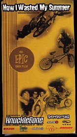 Produced by Brandon Fenton. Flatland only. Released in 2001. Length 22 min. Reviews: BMX Action april 2001, Ride BMX US april 2001, ... Jared Souney, Ride BMX US, april 2001: Entertainment Quality: * /5 Production Quality: ** /5 "E-Clips" features two riders: Brandon Fenton and CHASE, who l've decided shall now be known in all capital letters. If anyone is deserving of a one-word title in all caps, it's CHASE. I don't know where artists like Prince and Madonna get off using one name when CHASE is on the scene. This video marked the first time I really got to see what Brandon Fenton s all about. l'd seen him ride at Burning Bike last year, but that didn't do him justice. Ho had some really cool combos in this video. CHASE's, of course, a master of his domain. He has more bike control than a human should have, and watching him leaves your jaw hanging below your belt. A video made up of only two guys could really suck, but not if CHASE is involved. I might suggest watching this, and then watching "Dorkin' Ten," because CHASE does some even more incredible stuif in that ! |